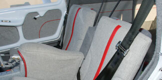 Picky about matching colors, Danny said his dad couldn’t find vinyl that matched the airplane’s red trim, so he went with black vinyl and houndstooth fabric. The black vinyl panel aft of the baggage compartment not only displays Scrappy’s embroidered image and name, it hides a boo-boo with the paint, a run. Also located out of sight were baggage compartment pockets for a fuel tester, quart of oil, and Kenneth’s logbook.