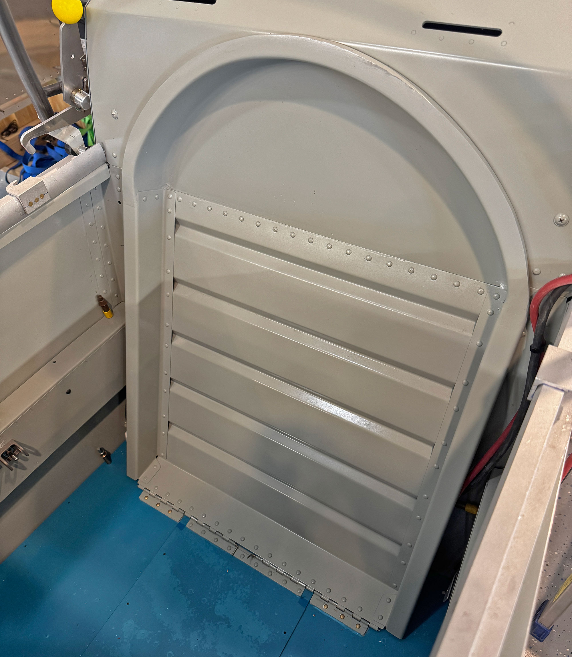 This is a twenty-something year old fiberglass part that has been packed away all those years, but we suspect that there was some mold release of some type still on the glass, and I didn’t do a good enough job of cleaning and scuffing before going to the paint booth. At any rate, out came the sanders and off came this atrocious stuff. The second picture shows the final result after re-cleaning and repainting—nice enough to call it done! Truth is, as long as the cushion is in place, no one would have ever seen it but I’d know it was there, and would see it every time I took the seats out for maintenance.