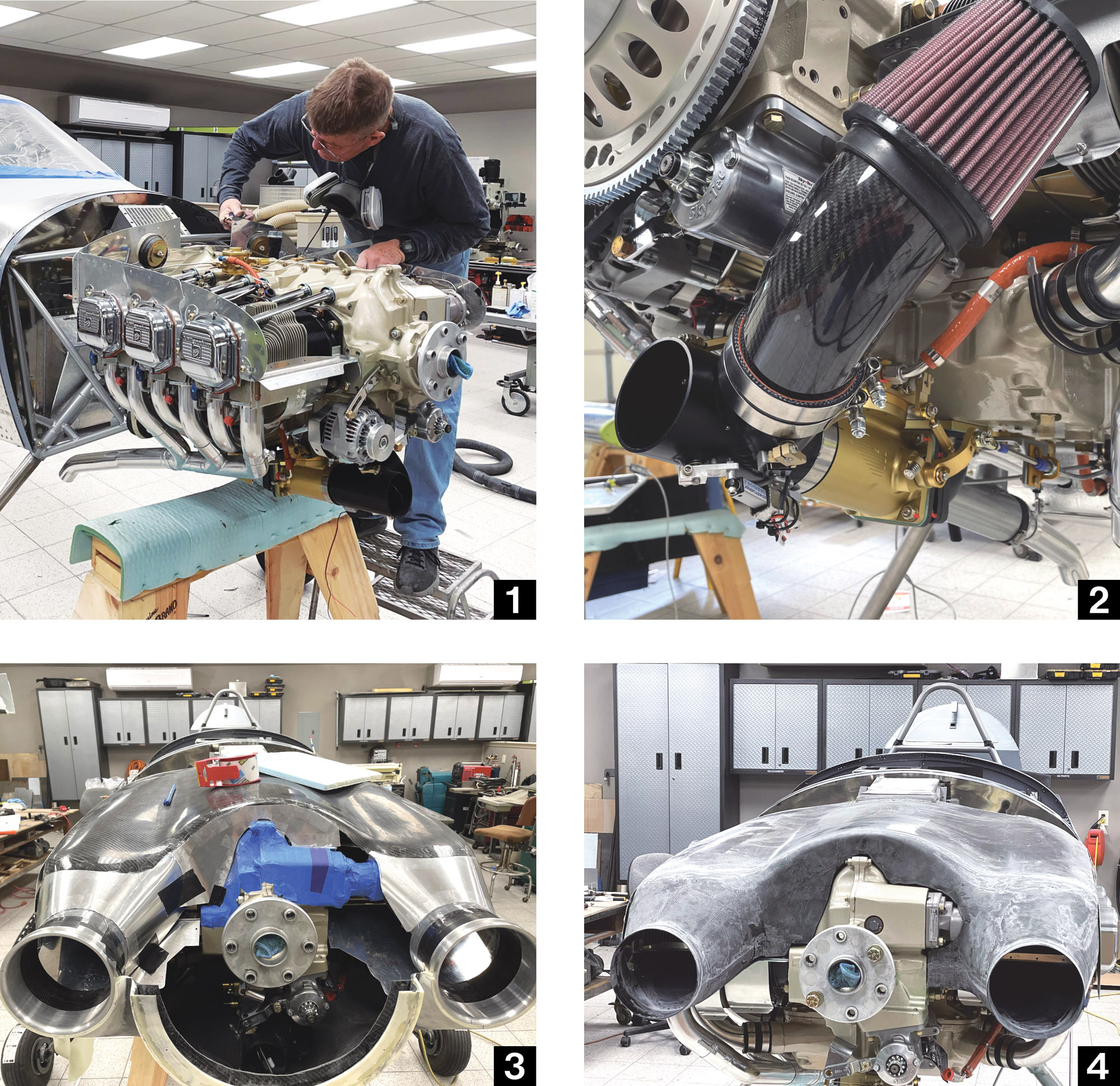 Darryl spent over two months redesigning and constructing the engine cowling and plenum. The two-blade Whirl Wind prop he selected for the engine had an interference problem with the cowling so he extended the prop forward by 1 inch. While in the neighborhood, Darryl increased the cooling air inlet diameters from 5.5 inches to 6 inches, requiring all new cooling coupling rings and a rework of the entire front of the engine cowl. He then set to work on the plenum, which did not fit to his liking. Using the old plenum as a form, Darryl fabricated an entirely new plenum out of carbon fiber, which he worked, reworked and reworked some more until it came out perfect.