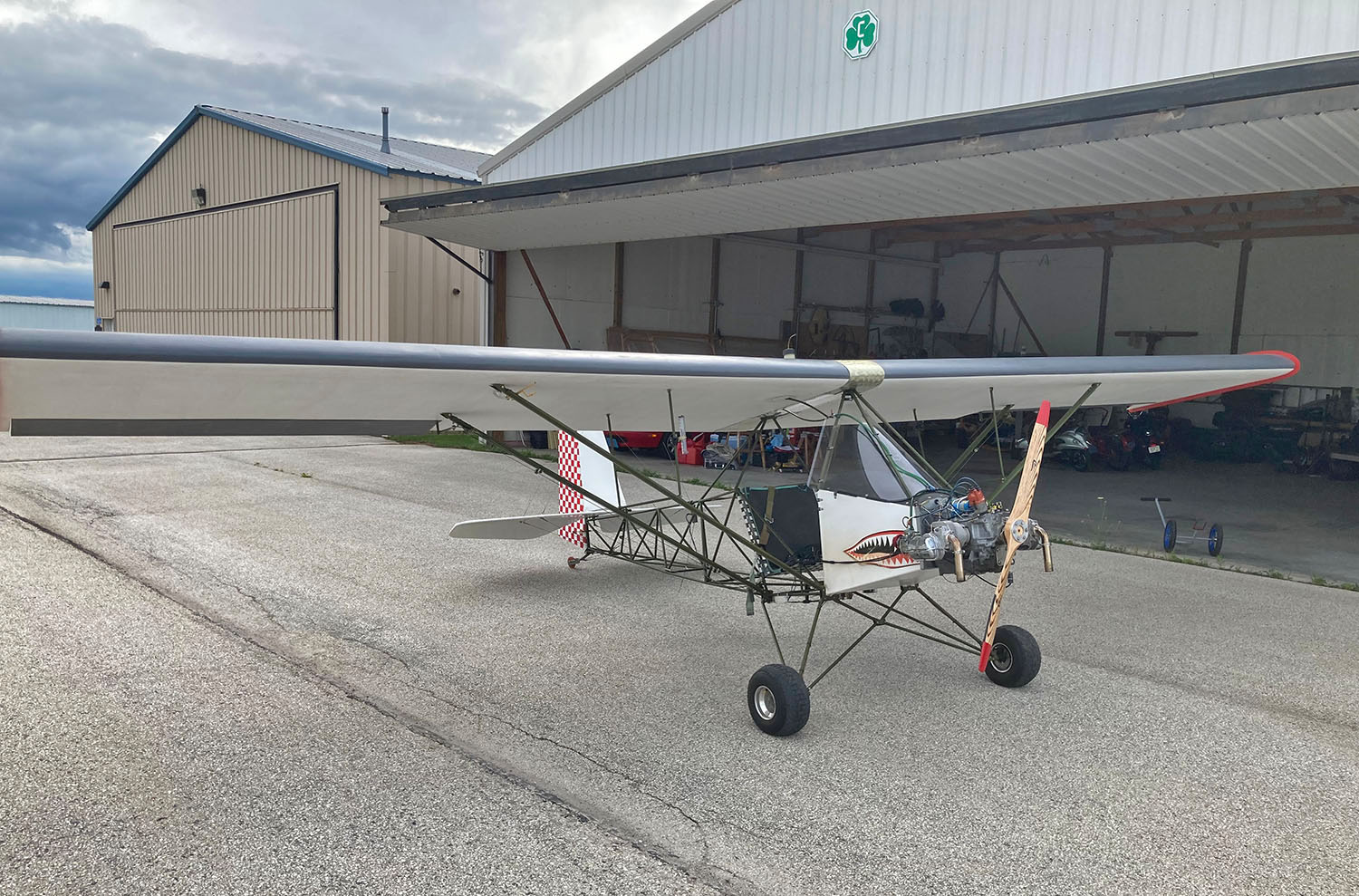 I completed my Legal Eagle XL at home and covered the wings in my living room and dining room over the winter. Great Wife!! 1.5 years until first flight. I flew it off grass while only having 3 hours tail time in a PA-12. All went very well, it’s a very honest airplane. I just made the 254-pound limit using aluminum jugs for the motor, a very light paint job, low pressure tires, for suspension etc.